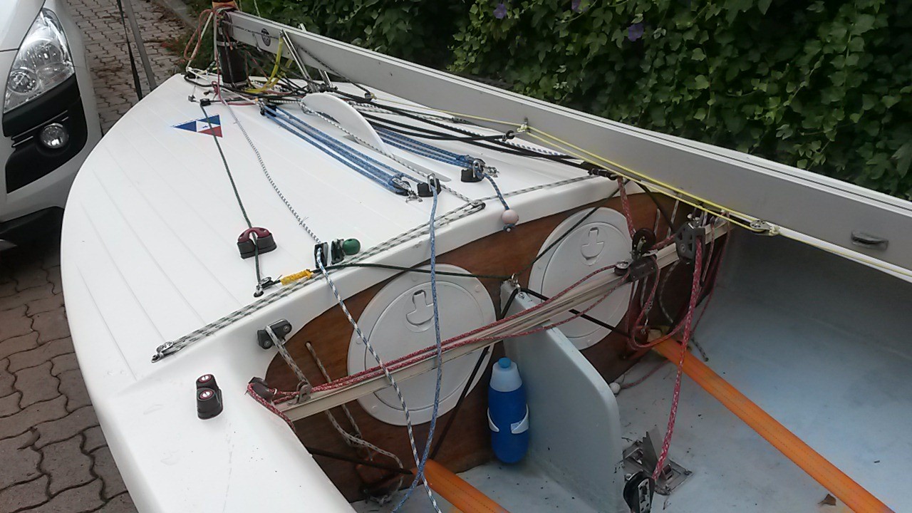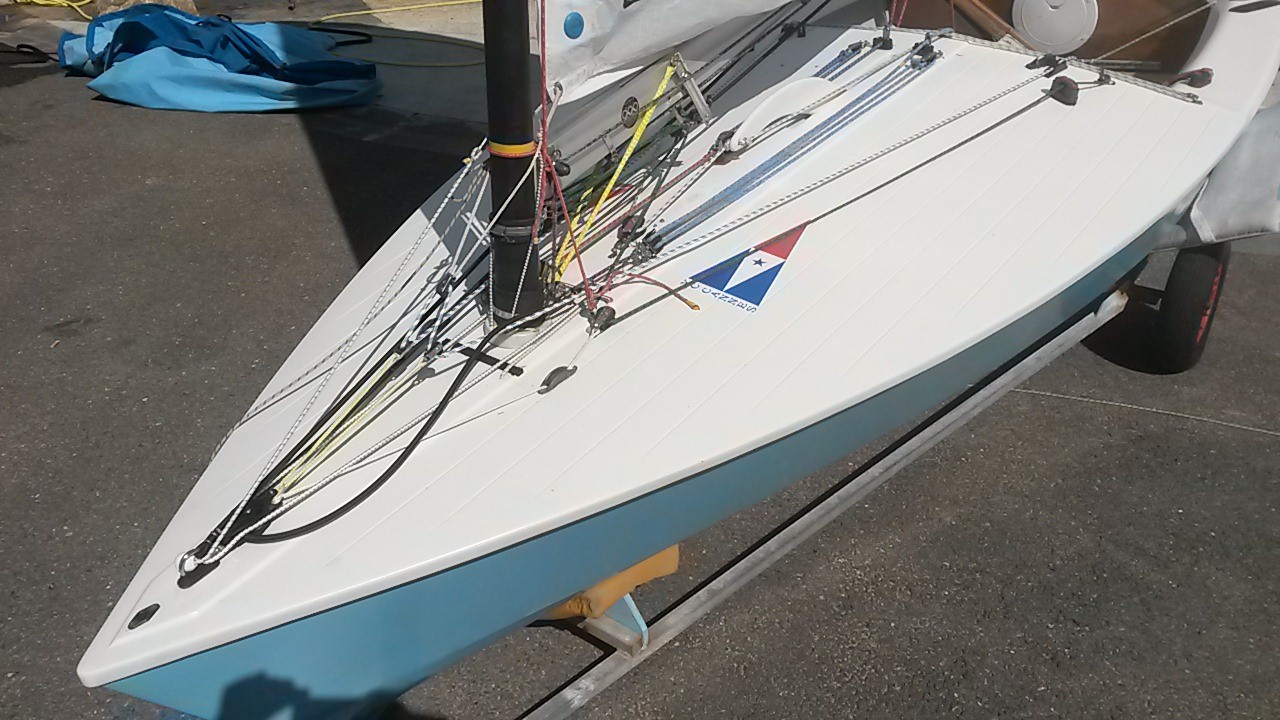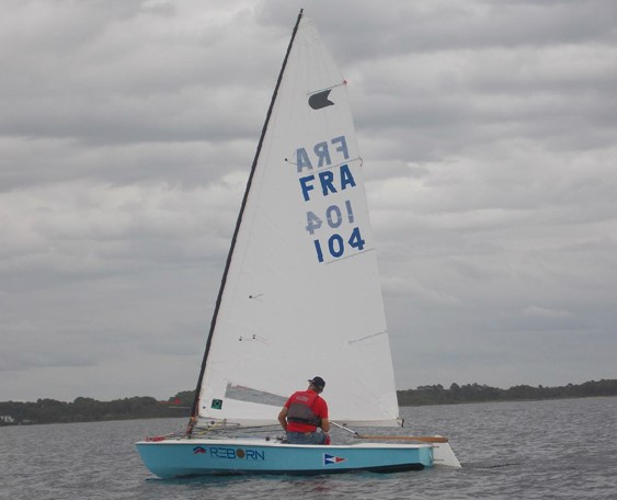 - Coque bleu ciel et pont blanc. Dérive et safran bois/epoxy.